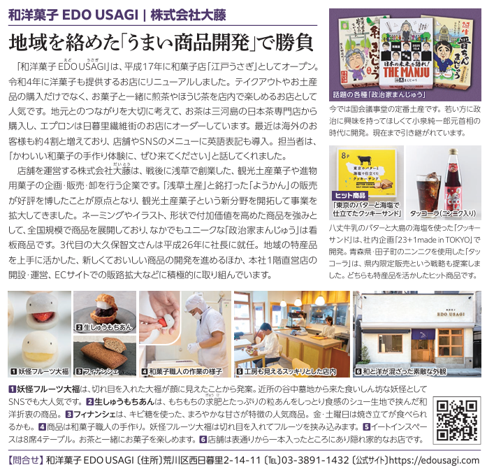 【ライブラリー45】あらかわ産業ナビにて紹介されました 2025/12/11(木) ライブラリー あらかわ産業ナビにてご紹介いただきました 2025年11月21日発行・あらかわ産業ナビvol.182にて、和洋菓子 EDO USAGIをご紹介いただきました。 モノづくり企業探訪のページにて掲載されています! モノづくり体験教室のことをはじめ、EDO USAGIの本社・株式会社大藤のことまで、詳細にご紹介いただきました。 是非ご覧ください♪