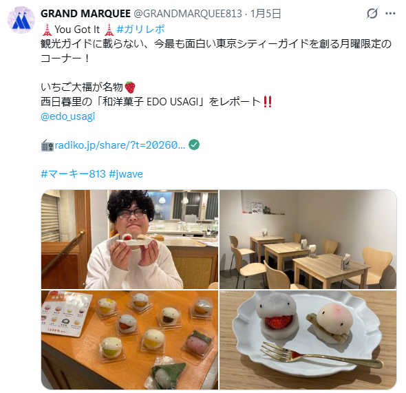 2026年1月5日、ラジオ「GRAND MARQUEE」にて妖怪★いちご大福と花びら餅をご紹介いただきました。